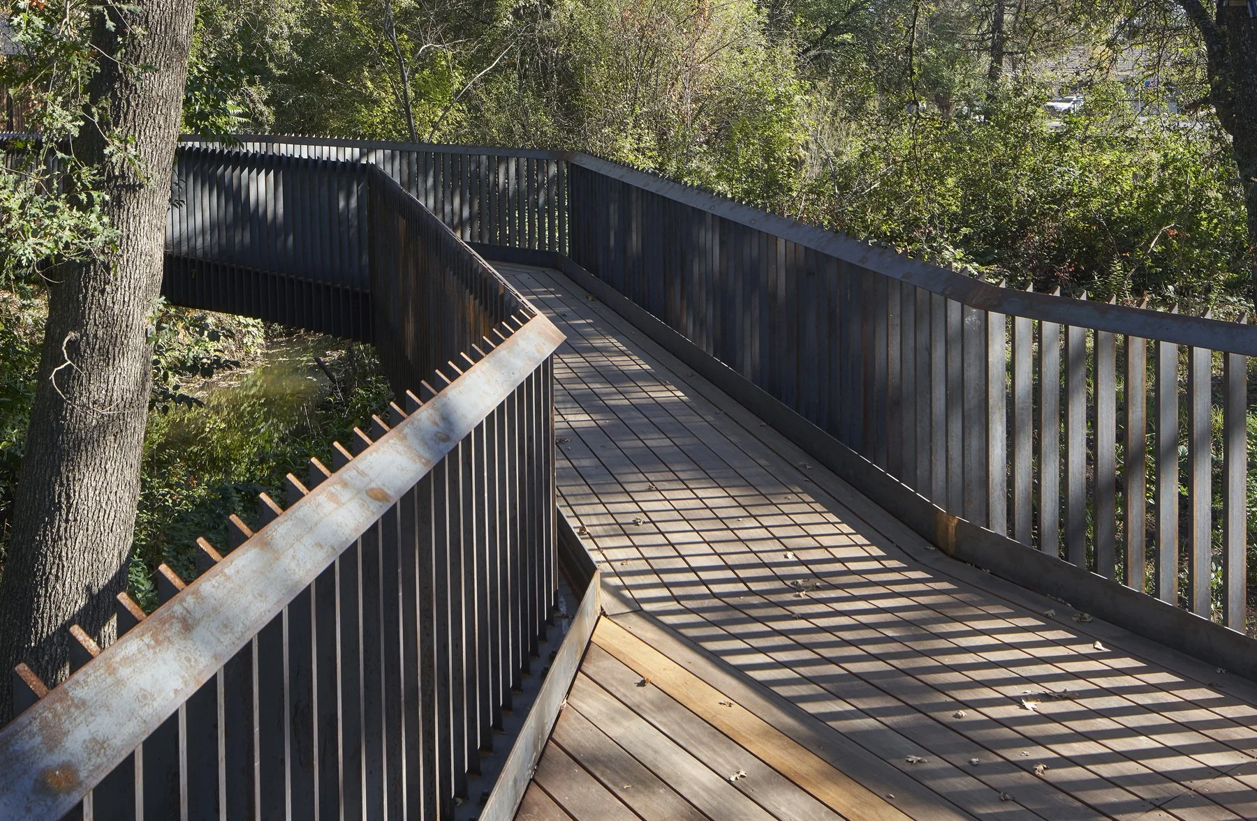 A custom, corten steel bridge and secret patio at a boutique hotel in the heart of Sonoma County wine country.